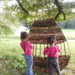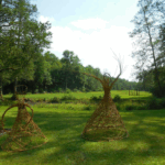 Confection de 3 silhouettes en osier sec dans le jardin du presbytère, l’approche est de réaliser des personnages en différentes postures ( verticale, en mouvement des bras et du corps , une troisième assise sur le mur qui borde le jardin).